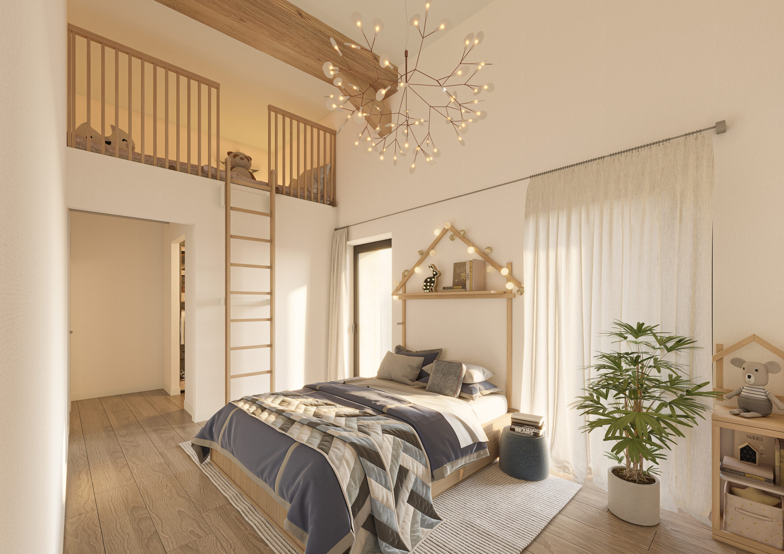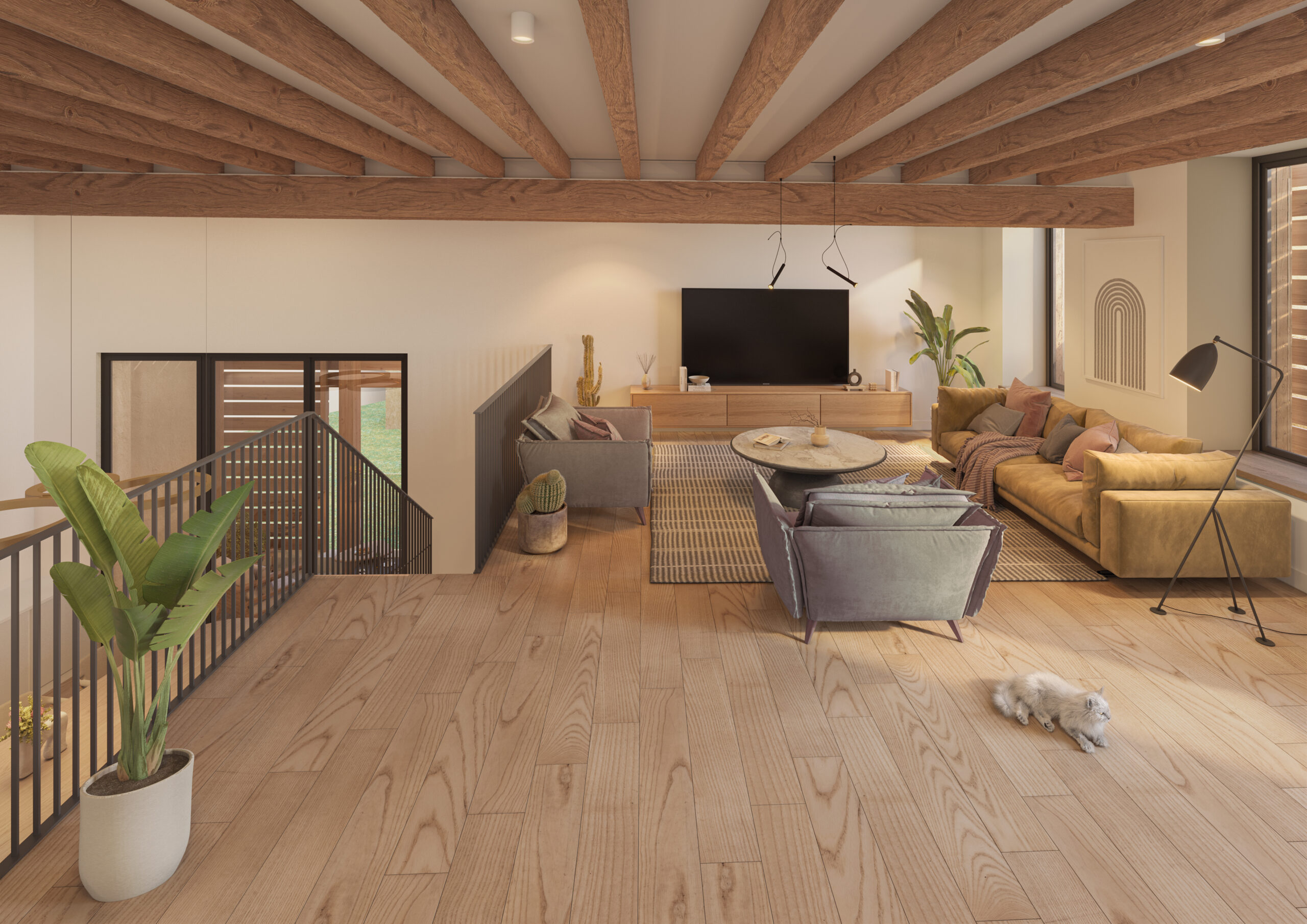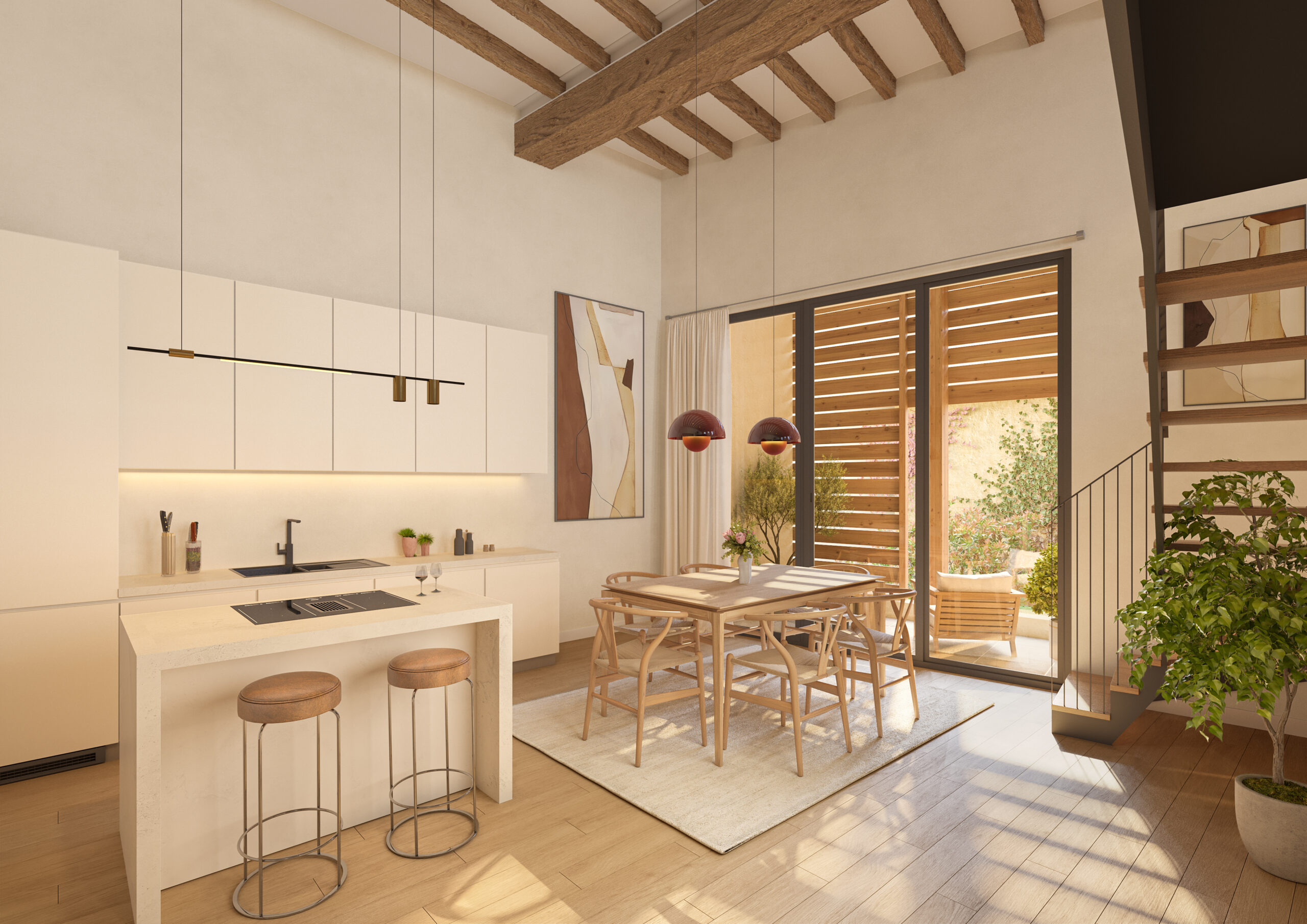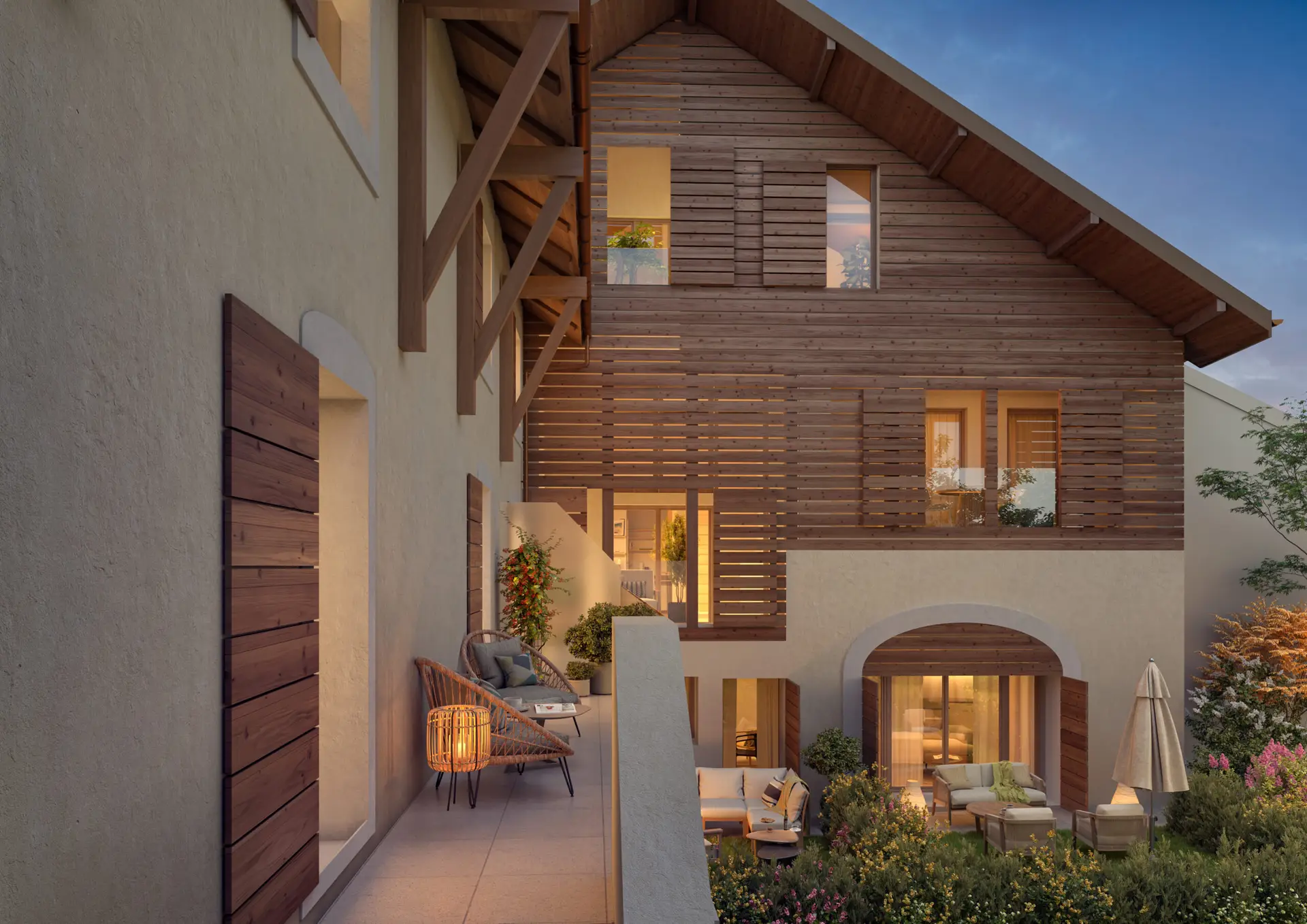 Pour apporter davantage de lumière, des ouvertures ont été créées dans la façade sud de la grange, permettant l’aménagement de loggias parfaitement intégrées à l’architecture existante. Ces espaces, agrémentés de volets en bois et de garde-corps en verre, apportent une touche contemporaine discrète à l’ensemble. Les grandes baies vitrées, ouvertes sur les loggias, prolongent les espaces de vie vers l’extérieur, créant une atmosphère intime et chaleureuse.