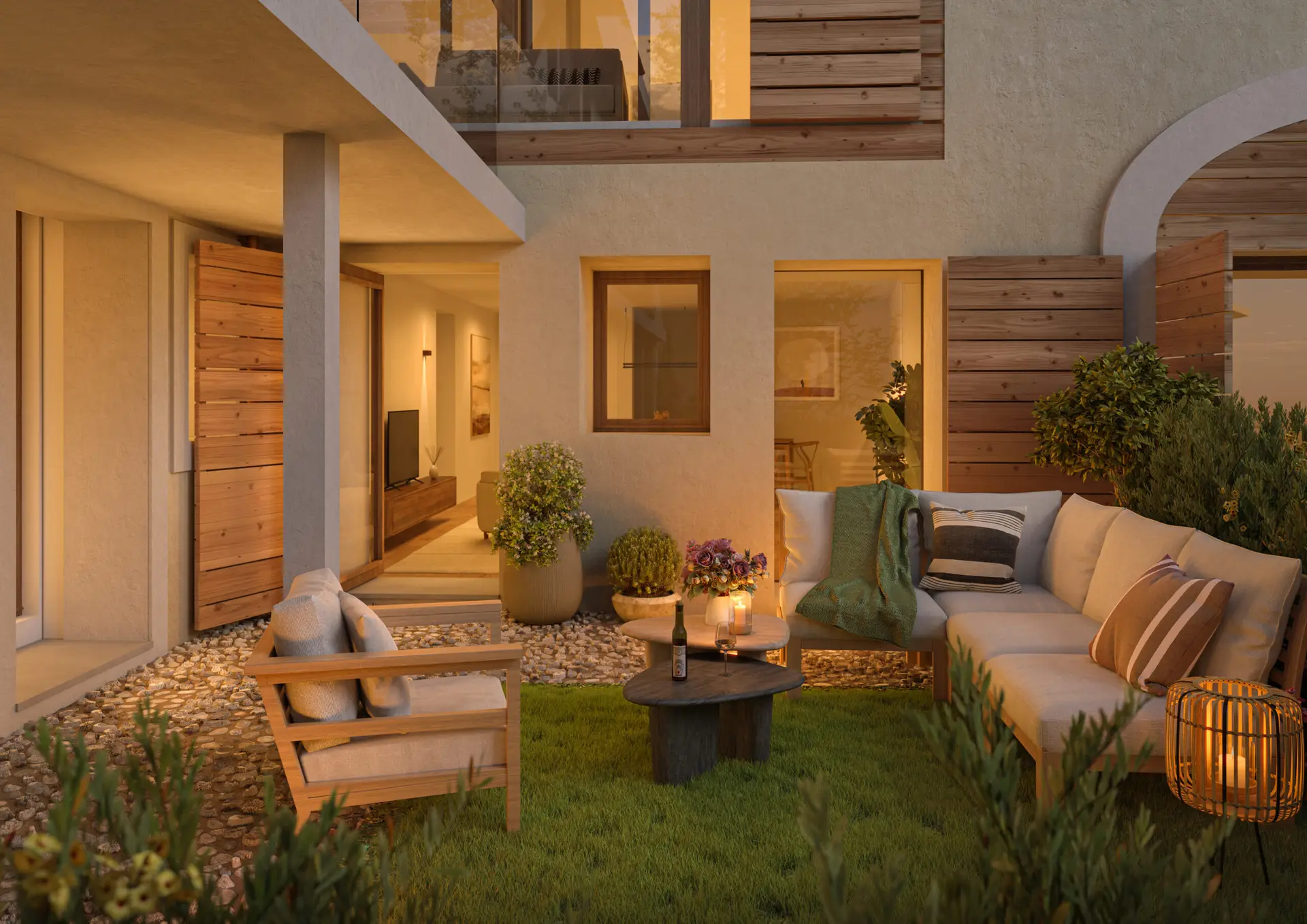 Ce projet s’inscrit également dans une démarche durable avec l’intégration d’une pompe à chaleur géothermique et l’installation de panneaux photovoltaïques en toiture. Chaque appartement bénéficie d’un espace extérieur privé – balcon, loggia, courette ou jardin – et d’un accès à une cour commune, favorisant les échanges et la convivialité entre les résidents.